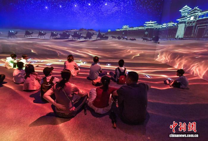 8月26日,乘客带着孩童正在新疆专物馆沉醉接互剧院,席天而坐旁观汗青影片。中新社记者 刘新 摄