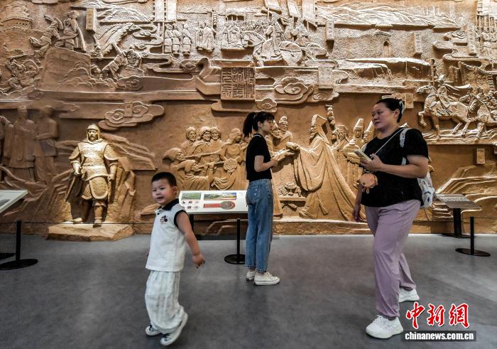 8月26日,搭客带着小孩正在黑鲁木全市专物馆观光“汉统西域浮雕”。中新社记者 刘新 摄